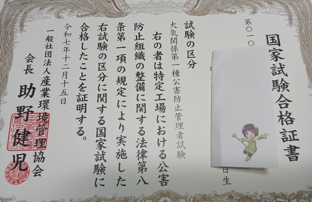 10月に受けた公害防止管理者試験(大気関係第1種)、既に合格発表は済んでいますが、合格証書が届きました。